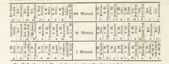 Das erste Manual dirigiert 17 Stimmen, worunter drei 16füssige mit 2 aufschlagenden Zungenwerken sich befinden, der Charakter desselben ist großartig und brillant; das zweite Manual 11 Stimmen, worunter Eine 16füssige und 1 einschlagendes Zungenwerk ist, sein Charakter ist kräftig und zugleich angenehm; das 3te Manual 9 Stimmen worunter 1 einschlagendes Zungenwerk( Physharmonika 8 Fuß) zum anschwellen eingerichtet ist, daß mittelst Pedal die Töne vom leisesten Hauch bis zu einem ziemlichen Forte modulirt werden können, dem Character nach lieblich; und das Pedal 13 Stimmen worunter Eine 32füssige, überhaupt aber 5 aufschlagende Zungenwerke sind, von sehr kraftvoller und den 3 Manualen angemessener Wirkung.