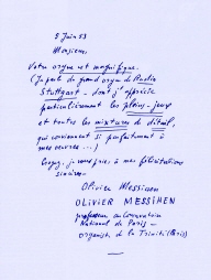 Messiaen, dessen Orgelwerke “tönend gefasste Theologie” seien, findet hier in der Villa Berg also eine Orgel außerhalb des Kirchenraumes vor, wo seine Musik doch aus der Praxis des katholischen Gottesdienstes erwächst; und er findet Gefallen an dieser Orgel, die er erneut im Frühjahr 1953 aufsucht.