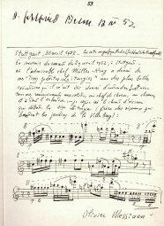 Beide Besuche sind schön dokumentiert. Beim ersten Mal trägt sich Olivier Messiaen ins Gästebuch des Süddeutschen Rundfunks unter der Unterschrift von Dr. Gottfried Benn ein, mit einem Notenzitat der Takte 1-6 aus dem Soloklavier seiner Trois petites liturgies. In den Arbeitspausen, so wird berichtet, ging Oliver Messiaen hinaus in den Garten der Villa und zeichnete die Notenschrift beim Hören des Gesangs einer Amsel auf, was zu späteren Kompositionen führte.