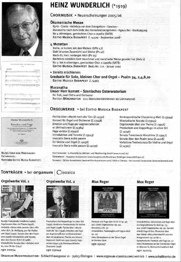 e fest, dass mit seinem klaren Bekenntnis zu Reger und der Straube-Schule, diese Verquickung von Romantik und Faust elementar vorhanden ist. Das "auf den Grund gehen " kann umschlagen in "es nicht mehr weitergeben können"; doch hier haben wir es mit Musik zu tun, und diese Musik wird weitergetragen in Form von Klangkonserven, von Schallplatten und OrgelCD's, die wiederum interpretationsfähig sind. Der Mensch Wunderlich hat sich bisher kaum schriftlich über seine Interpretationen und sein Leben geäußert, daher ist es eine große Genugtuung hiervon einen Zipfel erhascht zu haben. Etwas, das aus dem Leben dieser Musik herausragt, ein Kommentar dazu, eine Deutung.