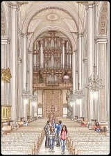 hier beigefügt). Darin wird auf erstklassige Weise sowohl Technik wie Stellung der Orgel aufgezeichnet. Mich hat besonders beeindruckt die Darstellung der 9 durchschlagenden Zungenregister, worüber wir regen Diskussionsaustausch mit verschiedenen Interessenten führen. In jedem Fall tritt als ganz besonderes Register die Bombarde 32' als durchschlagend hervor, mit Maßen von 3m Fußlänge und einem Resonator mit 6,5m Länge. Diese Maße sollten von der Eberhard Friedrich Walcker-Orgel aus Boston übernommen worden sein, wo zum ersten Mal auf dem amerikanischen Kontinent derartige Pfeifenregister eingebaut wurden.