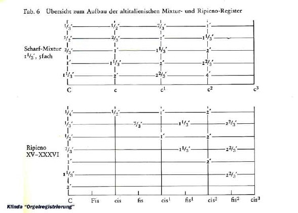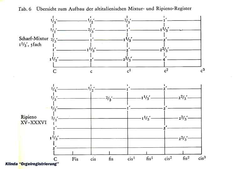 Während bei Mixturen (Scharf, Zimbel) die Repetitionspunkte regelmäßig verteilt sind, nimmt beim Ripieno ihre Zahl in der Höhe zu; in der tiefen Lage kommen keine Repetitionen vor, in der mittleren wenige, in der hohen zunehmend mehr. Die hohe Lage verliert an klangspektraler Breite, wird aber mehrchörig. In der Tabelle 6 sind diese unterschiedlichen Verhältnisse schematisch dargestellt.