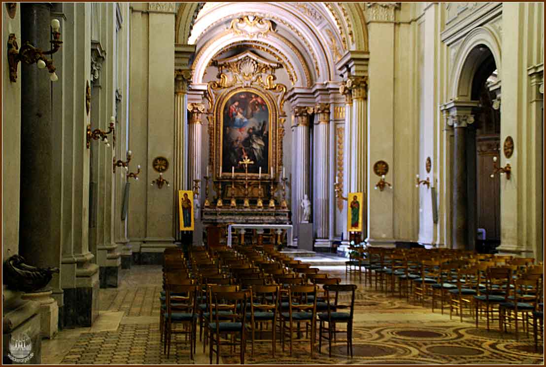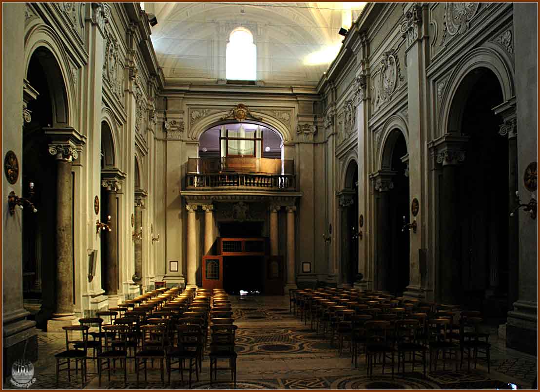 Der Innenraum den Francesco Ferrari im 18.JH umgestaltete, ist abgesehen von den Mosaikböden und einigen antiken Säulen, reinstes Barock. Am Ende des rechten Seitenschiffes liegt die Kapelle des heiligen Gregor von der aus man die Cella di San Gregorio erreicht, in der der Bischofsstuhl des heiligen Gregors zu bewundern ist.