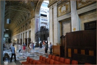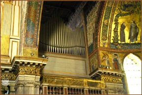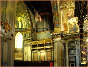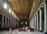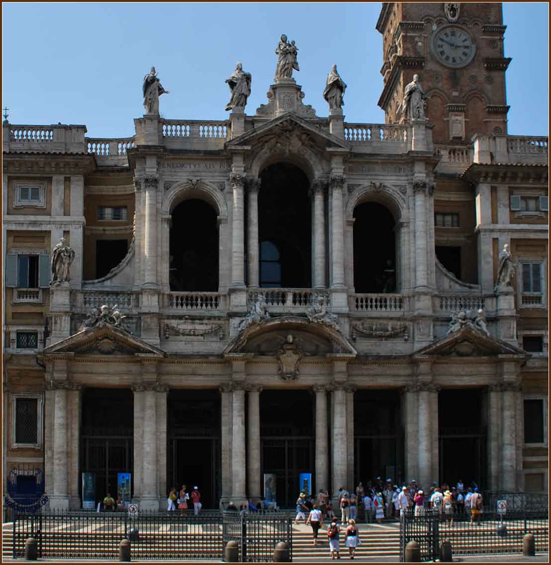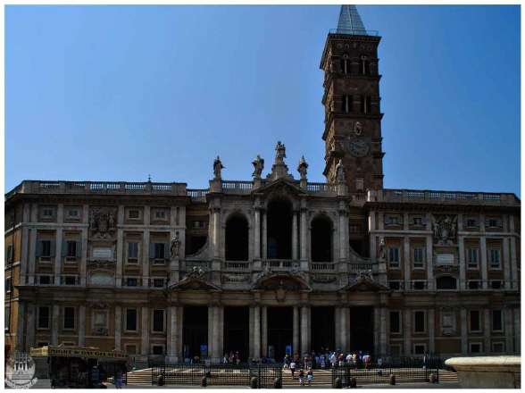 Santa Manria Maggiore gilt als schönste Basilika Roms. Ihren kunstgeschichtlichen Wert verdankt sie dem harmonischen Zusammenspiel diverser Stile. Der dreischiffige Innenraum geht auf den Urbau aus dem 5.JH. zurück. Der Mosaikfußboden, eine Cosmaten-Arbeit, und der romanische Campanile stammen aus dem Mittelalter. In der Renaissance wurde die Kassettendecke hinzugefügt, das Barock brachte die Doppelkuppeln sowie die eindrucksvollen Fassaden. Die biblischen Szenen im Langhaus sowie die spektakulären Mosaiken des Triumphbogens datieren aus dem 5.JH., das Apsismosaik entstand 1292-95.