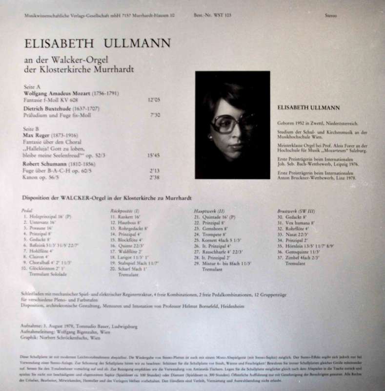 Die Schallplatte von Elisabeth Ullmann wurde vom Verlag meines Vaters, dem Musikwissenschaftlichen Verlag mbH erstellt und am 3.Aug. 1978 durch Tonstudio Bauer aufgenommen und wird hier als MP3-Sammlung kostenfrei zur Verfügung gestellt.