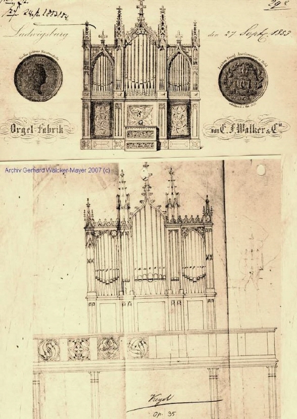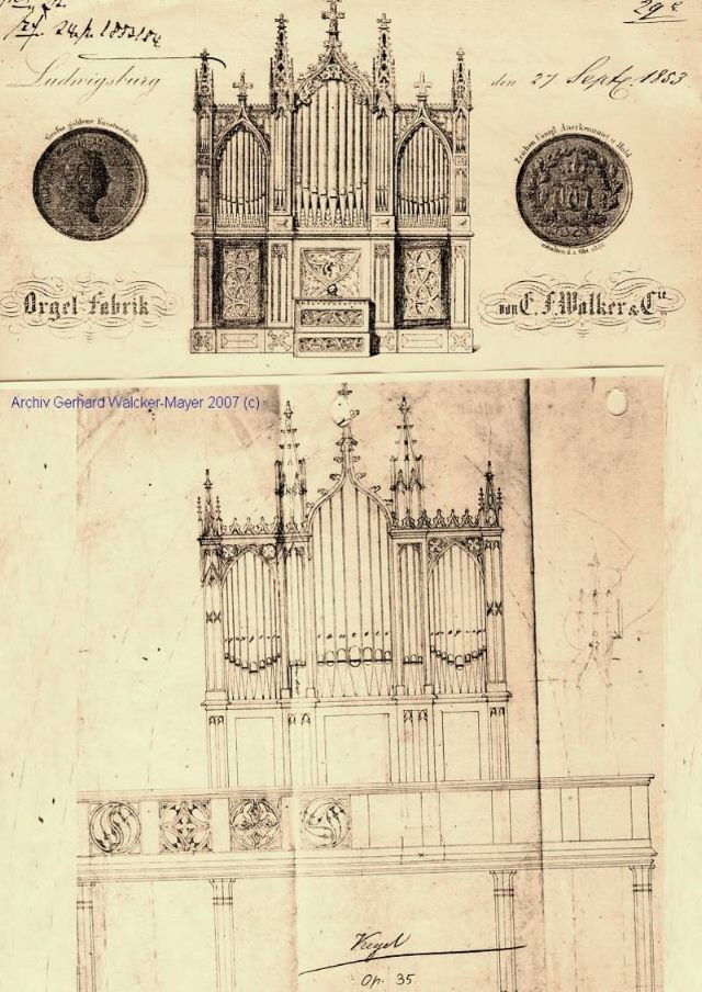 Diese Orgel, die weitgehend erhalten ist, wurde 1841 mit Schleif- und Kegelladen gebaut. Lt. Auskunft eines ansässigen Orgelbauers sind die Pedalladen mit drei Registern in Kegelladen gemacht. In jedem Fall die erste Orgel wahrscheinlich weltweit, die in Deutschland gefertigt und im Ausland aufgestellt wurde mit jenem Windladensystem. Interessant an dieser Orgel ist aber auch, dass Eberhard Friedrich diesen Prospekt als Vorlage für einen reich verzierten Orgelprospekt für seinen Briefkopf verwendete. Diese Grafik wurde allerdings, wie man an div. Einzelheiten sieht nicht von einem Orgelbauer gemacht.