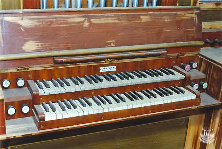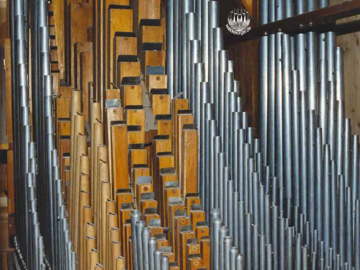Das Pfeifenwerk ist an filigraner Feinheit kaum mehr zu überbieten, man sehe nur diese gedrechselte Traversflöte. Die Reihenfolge oben auf der mechanischen Kegellade von links nach rechts: II Aeoline 8', Traversflöte 4' - I Flöte 8', Dolce 4', Viola 8', Spitzflöte 8', im Pedal unter der Lade gibt es einen satten, durchschlagenden Serpent 16' gerhard@walcker.com |