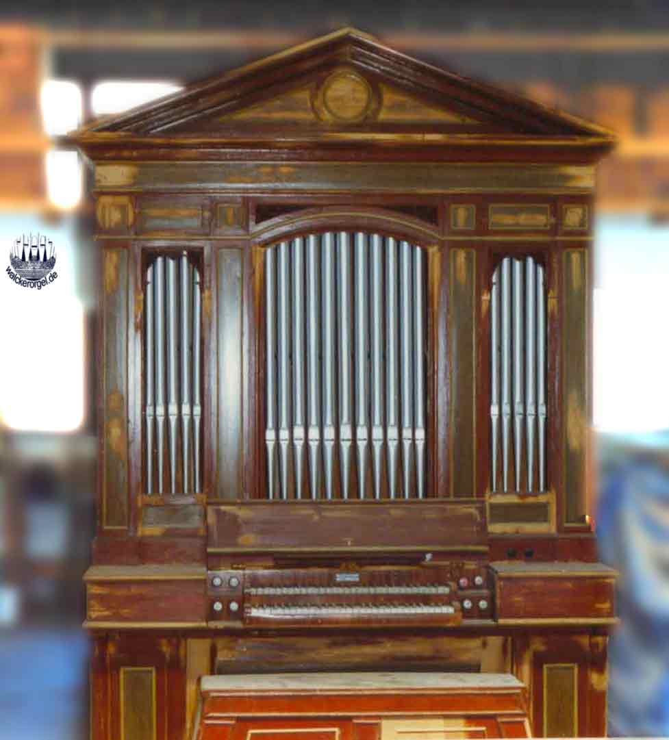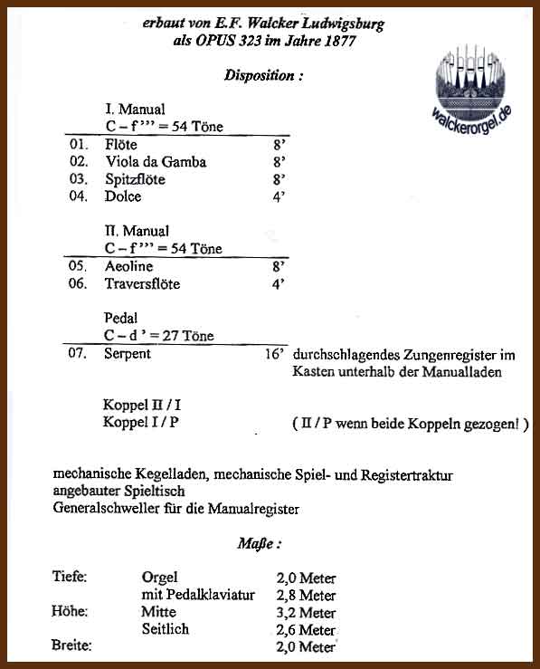 Die Walcker-Orgel Opus 323, ich habe bisher mit 8 verschiedenen Organisten Verkaufsgespräche geführt, und man sollte es nicht für möglich halten, dass dieses klanglich schönste Instrument, das mir je begegnete, keinen Käufer gefunden hat. Das ist eine Schande für die Zunft. Nun liegt sie verpackt schon über 10 Jahre bei einem Orgelbauer und wird für 12.000 Euro, weit unter Wert angeboten. Lediglich die Oberfläche des Gehäuses und die Neueinrichtung des Gebläses sind bei diesem Preis noch nicht berücksichtigt. Höhe: 3,20m Breite 2,0m, Tiefe 2,0m |