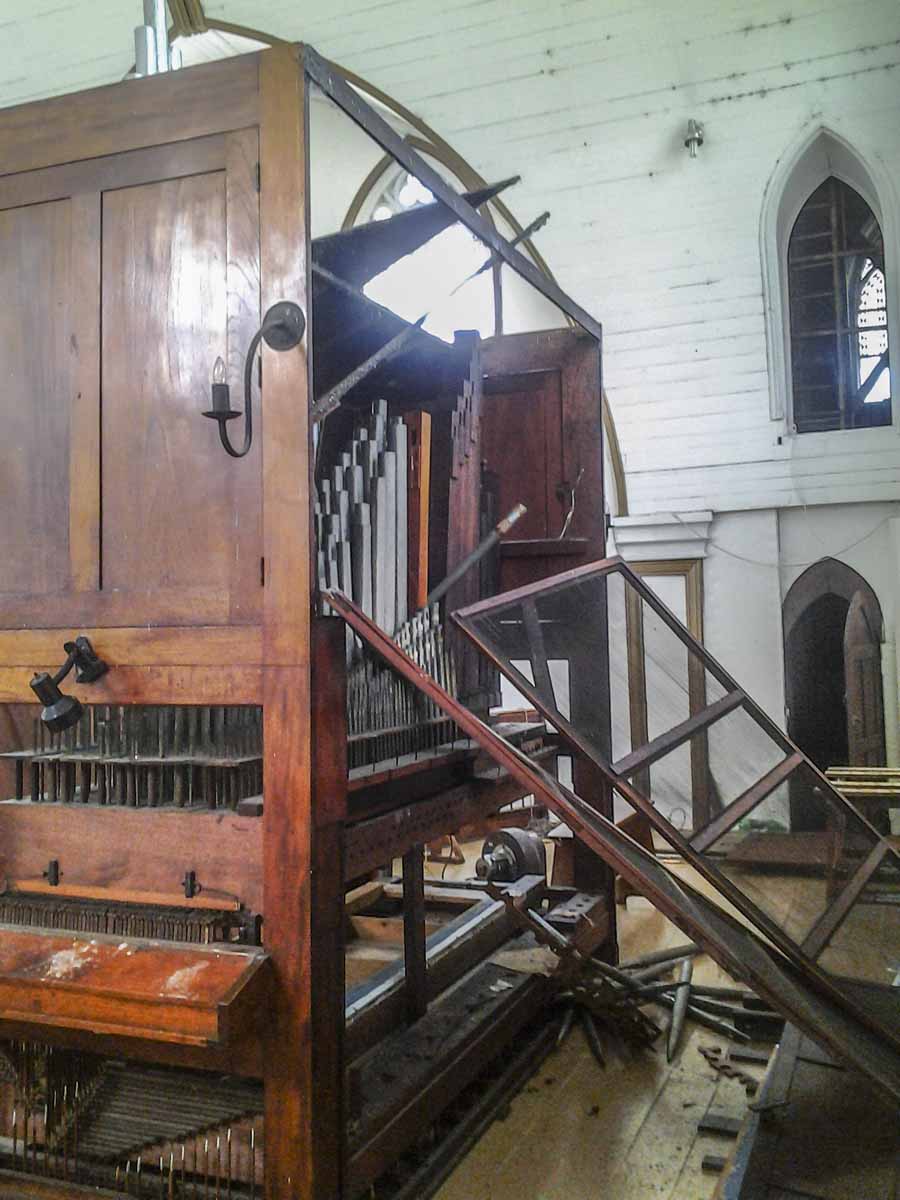 In Costa Rica fand Anfang Oktober 2012 ein Erdbeben statt, dass auch unsere Walcker-Orgel beschädigte. An den nachfolgenden beiden Bildern kann dies leicht nachvollzogen werden.