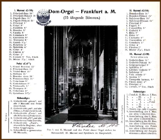 Und ab heute wissen wir, dass die glatte und runde Zahl Opus 600 im Jahre 1891 für die Frankfurter Domorgel mit Sicherheit die erste große pneumatische Kegelladenorgel war. Auf die Walcker jedoch nicht explizit hingewiesen hat. Wahrscheinlich gab es Schwierigkeiten. Denn der Spieltisch stand rund 20m von der Hauptorgel entfernt im Hauptschiff der Kirche. Während I., II. Manual und Pedal im Seitenschiff standen.
