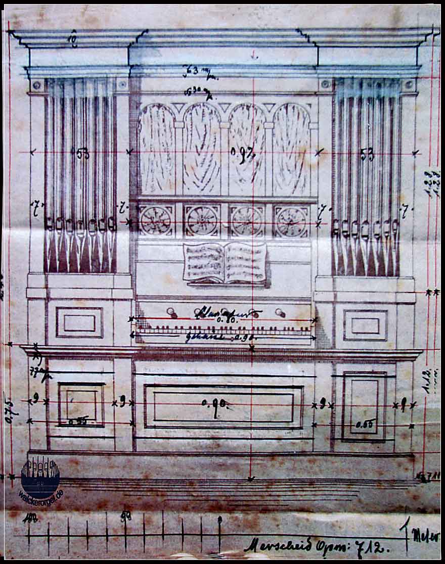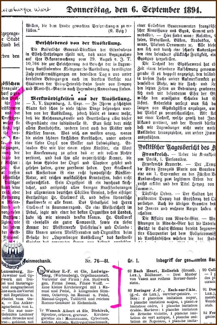 Diese Orgel hat dieselbe Disposition wie das Instrument nach Merscheid, Luxenbourg, Opus 712, bei der entsprechenden Ausstellung. Weiter unten sind zwei Zeitungsartikel, welche diese Orgel beschreiben und ein Loblied auf die Qualität dieser Walcker-Orgel. Weswegen bei mir der Verdacht ist, dass es sich um ein und dieselbe Orgel handelt, sie wurde eben umgebaut.