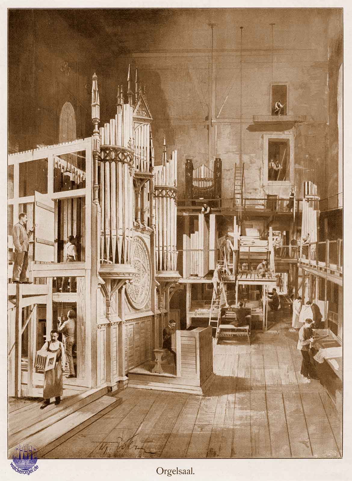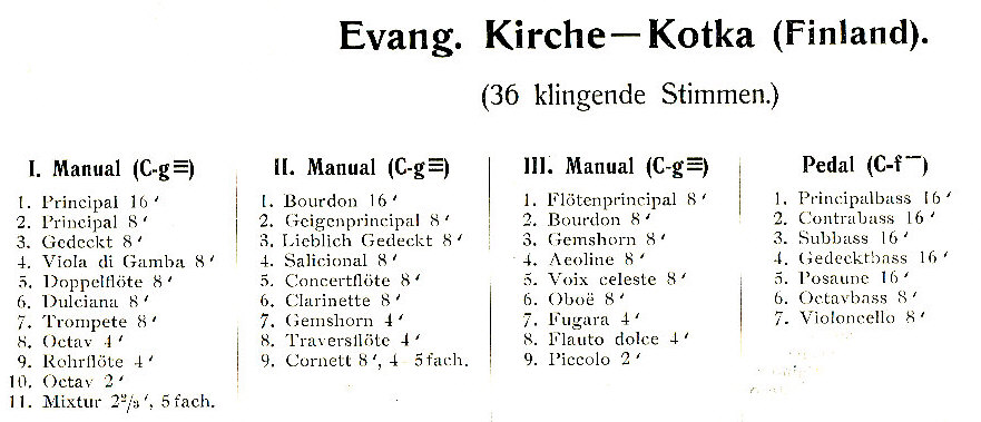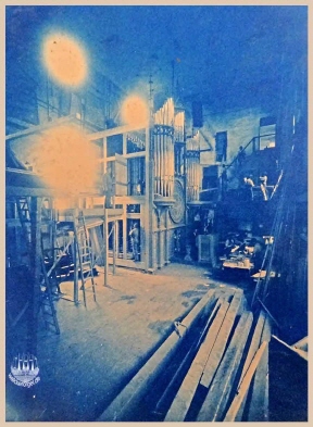 Durch einen Zufall fiel mir das originale Foto dieser Orgel (blau, unten), die 1901-02 nach Kotka, Finnland gebaut wurde, in die Hände. Denn diese Orgel gelangte zu einiger Berühmtheit dadurch, dass sie in dem Walcker-Prospekt von 1902 im Montagesaal der Firma Walcker ausgestellt war, und die dadurch das Interesse vieler Orgelfreunde geweckt hat. Niemand konnte in neuerer Zeit sagen, um welche Orgel es sich handelte. Wir sehen, dass 1902 auch ohne Photoshop ganz schön dazugedichtet werden konnte. Interessant ist die Retuschiertechnik, weil sie die Vorstellung der Orgelbauer offenbart, wie ihre Werkstatt auszusehen habe. Sehr schön die einretuschierte "Dulsanell" in der Mitte oben und die Damen rechts unten. |