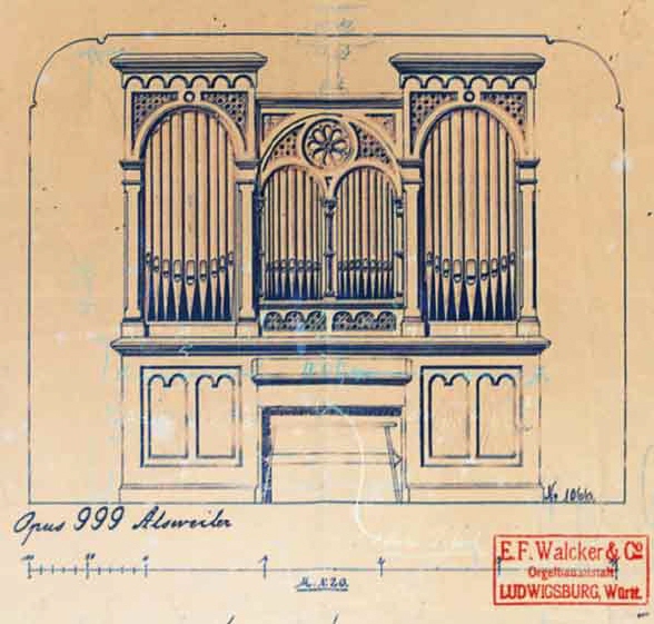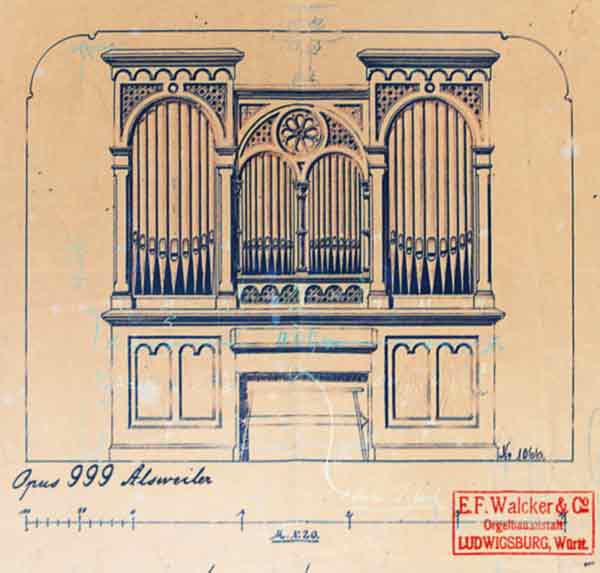 Opus 0999 Ort Alsweiler bei St. Wendel Kath. Pfarrkirche Lade Kegelladen Traktur pneumatisch Quelle Opusbuch Walcker lt. Bestellung vom 25.Oct.1901 & nach unserer Disposition v. 18.Oct. 1901Lieferbar spätestens 1.Sept. 1902 I.MANUAL C-g3 1. Bourdon 16' 2. Prinzipal 8' EMens. 3. Salicional 8' 4. Viola di Gamba 8' 5. Flöte 8' 6. Octav 4' 7. Rohrflöte 4' 1938 geänd.: Nasat 2 2/3 + Schwiegel 2' 8. Mixtur 3f 2 2/3' II.MANUAL 9. Geigenprinzipal 8' 10. Liebl. Gedackt 8' 11. Aeoline 8' 12. Voix celeste 8' von 4'an 13. Flauto dolce 4' 14. Piccolo 2' PEDAL C-f' 15. Violonbass 16' C-B mit Quinte 16. Subbass 16' 17. Octavbass 8' 18. Violoncello 8' 1938 geänd.: Bombarde 16' |