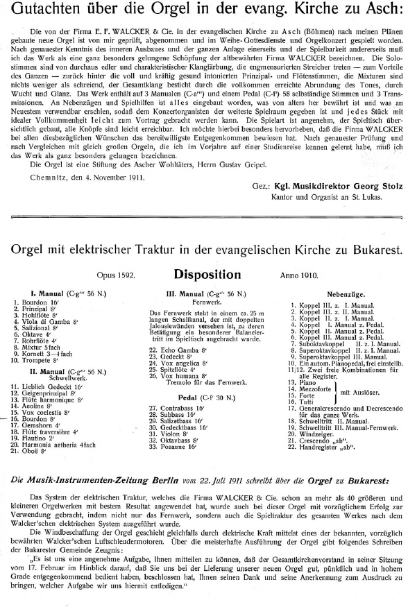 Die Walcker-Orgel Opus 1592 (Bj 1911) in der Evang. Kirche in Bukarest auch als Op.1708 III/33, Bj1912) Diese Orgel, an der ich morgen zugange sein werde, ist in der Tat eine Orgel die einige Abenteuer zu bestehen hatte. Ich habe sie jetzt mal etwas umfassender auf unserem Blog dokumentiert, weil ich immer noch der Meinung bin, dass dieses Instrument für die Rückführung auf ihren Originalzustand die beste Lösung wäre. Das erste Abenteuer war, dass sie kurze Zeit nach ihrer Einweihung abbrannte. Die damalige Königin Silva hatte schöne Tücher gefertigt, die in der Kirche hingen, alles ging samt erheblichen Teilen der Orgel in Flammen auf. Ein Jahr später wurde das Instrument wieder mit nahezu gleicher Dispo von Walcker erstellt und eingeweiht. Dann wurde die Orgel in 1964 mit neuen Kegelladen der Fa. Laukhuff unter Mitwirkung von Walcker umgebaut - und aufgehellt. Ein seltsames Fernwerk war plötzlich da und der Spieltisch wurde auf gut deutsch gesagt "versaut". Ursprünglich war die Orgel pneumatisch, dann wurde sie elektrisch und jetzt ist sie eben mit dieser grauenhaften Disposition, die ich nicht wage wiederzugeben. Alles in allem eine "monsterhafte" Entwicklung, wie sie im Lande Graf Draculas angemessen erschien- hoffen wir, dass nach der Restaurierung der Kirche ein paar Schritte in die richtige Richtung getan werden.