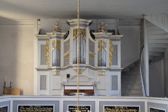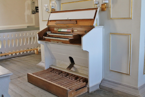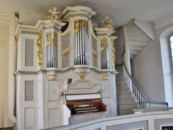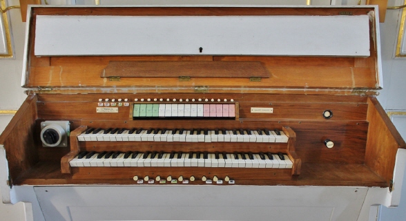 I.Man C-g''' 1. Bourdon 16 2. Prinzipal 8 3. Konzertfloete 8 4. Viola di Gamba 8 5. Salicional 8 6. Oktave 4 7. Mixtur 2 2/3 II.Man SW C-g4 8. Geigenprinzipal 8 9. Lieblich Gedeckt 8 10. Aeoline 8 11. Voix céleste 8 ab c 12. Traversfloete 4