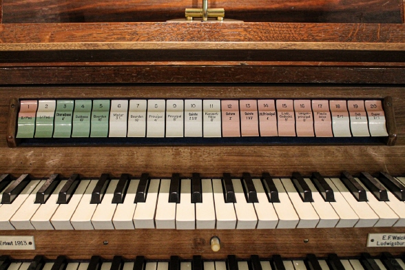 II.Man. SW C-g4 7. Salicional 8 8. Geigenprincipal 8 9. Aeoline 8 10. Voix céleste 8 11. Liebl. Gedeckt 8 12. Flauto dolce 4