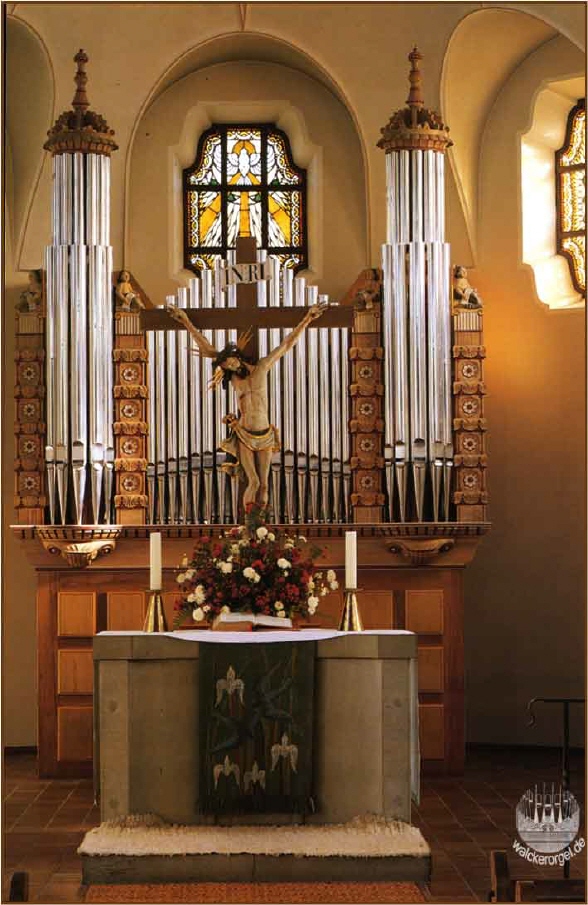 ........ ja, diese singenden Klänge hatten in den 70er Jahren keine Chance mehr, daher war der Beschluß schnell gefasst, eine deutliche Stehle-Orgel 1977 reinzusetzen, die allerdings noch zwei alte Register in den Manualen enthält: Salicional 8' und Traversflöte 4'; im Pedal gar ist alles beim Altem geblieben: Subbaß 16', Offenbaß 8', Choralbaß 4' und Rauschbaß 2 2/3' 3fach sind noch Walcker-Register. |