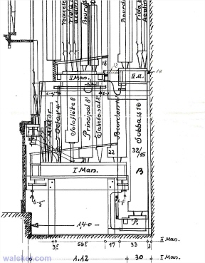 This drawing and thus the organ structure I would like to briefly explain: The wavy lines under the windchests on the right and left, radiating from the relay, you can see that it is pneumatic action, because these are the lead pipes. The drawing but tells some more details: we are dealing in II.Manual because of the transmission with a cone-chest. The 11.)Flauto 4 were transmitted the large pipes of 8) Bourdon. The I.Manual, pedal and the front-chest were made with Hängebalgladen (Roosevelt system) This system works more noiseless, but the transmissions not work as well as the cone-chest-transmissions. Two Hängebälgchen responsible for one pipe and the same hole gives the wind free for this one pipe, what makes problems. Here are two registers Bourdon 16 'and Salicional 8' transmitted from I.Manual down to the pedal. (see posting) The pedal may already be installed with big membranes installed horizontal. The organ must have sounded fantastic. We have a similar renovated in Cairo and partly renewed. |