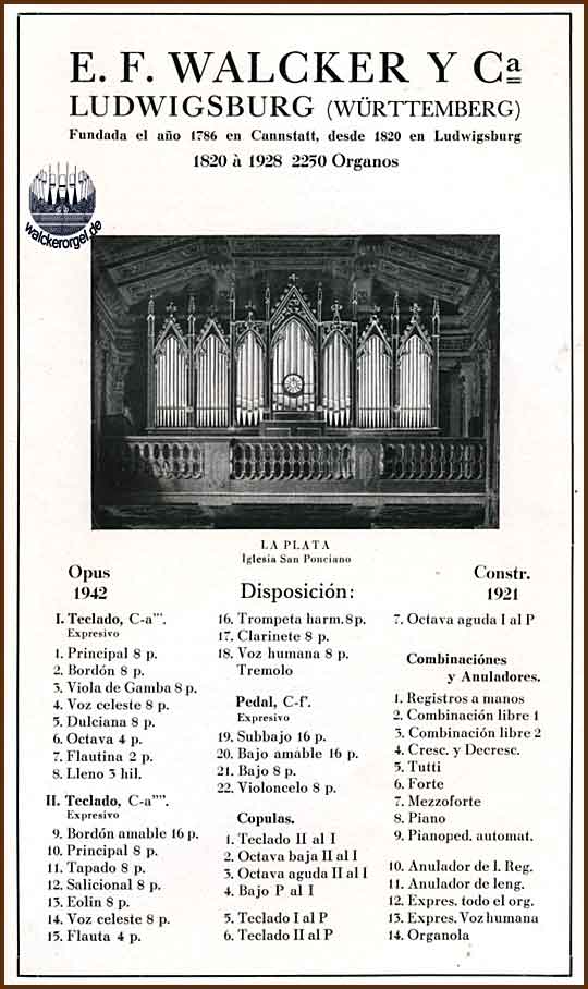 Die Orgel wurde bei Ihrer Firma 1910 von der Deutschen Evangelischen Gemeinde zu Buenos Aires (das ist die Muttergemeinde der EKaLP) bestellt und kam Mitte 1911 in Buenos Aires an. Sie erklang zum ersten Mal zu Weihnachten 1911, und am 28. Dezember wurde sie der Gemeinde und dem interessierten Publikum mit einem Konzert (Lobgesang von Mendelsohn-Bartholdy) vorgestellt. 1992 wurde sie gründlich restauriert.