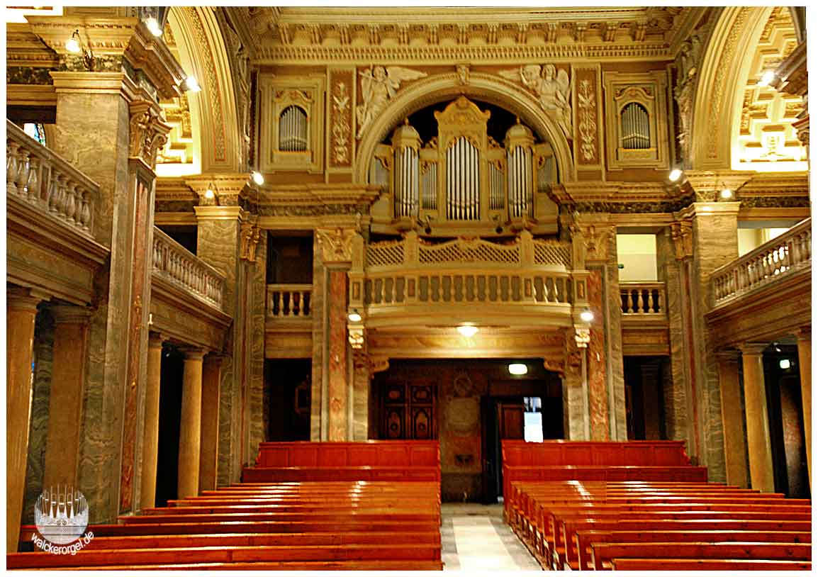 Eine der klanglich besten Orgeln Roms ist die Walcker-Orgel Opus 1956, gebaut im Jahre 1921 mit 24 Register auf zwei Manuale. Aber was heisst da 24 Register? Von der Kraft her schlägt sie mit Sub und Superkoppeln jede 70 Registerorgel der NEOs und von der Sensibilität und feinen Abstufung her kommt aus jener Ecke sowieso nichts diesen butterweich auf –und absteigenden Klangschattierungen höchster und feinster Graduierungskunst gleich. Dann aber trumpft das Instrument erst richtig auf: Einzelcharakteristiken wie die Quintade 8 im Hauptwerk habe ich überhaupt noch nie in einer Universal oder Neo-Orgel je gehört. Da ist ein lebendiges Klangspiel wie wenn noch ein Xylophon mit hölzernem Regen beteiligt sei. Eine ganz fein zurückhaltenende Flauto travers 8 im selben Manual mit dem Bourdon treiben das Holz hinaus in den Raum und spielen den magischen Spätsommer, als sei das Naturereignis ein Fest der Pfeifen. Tromba dolce 8, nur um eine wahrhaftige Trompete hier in Rom endlich einmalig gehört zu haben: schwerer, satter Zungenklang, etwas lieblich, der sein behäbig rundes Volumen mit absolut akurater Ansprache so über allen Dingen der Welt stehend ausspielt, dass man verzückt nach oben in das kassettenartige Dach hineinschaut, als sei der Klang dieser Trompete dort optisch greifbar. Ich glaube auch den ersten solid-unantastbaren Principal 8‘-Klang in dieser Stadt gehört zu haben: rund, breit, erhaben, ganze Majestät.