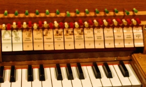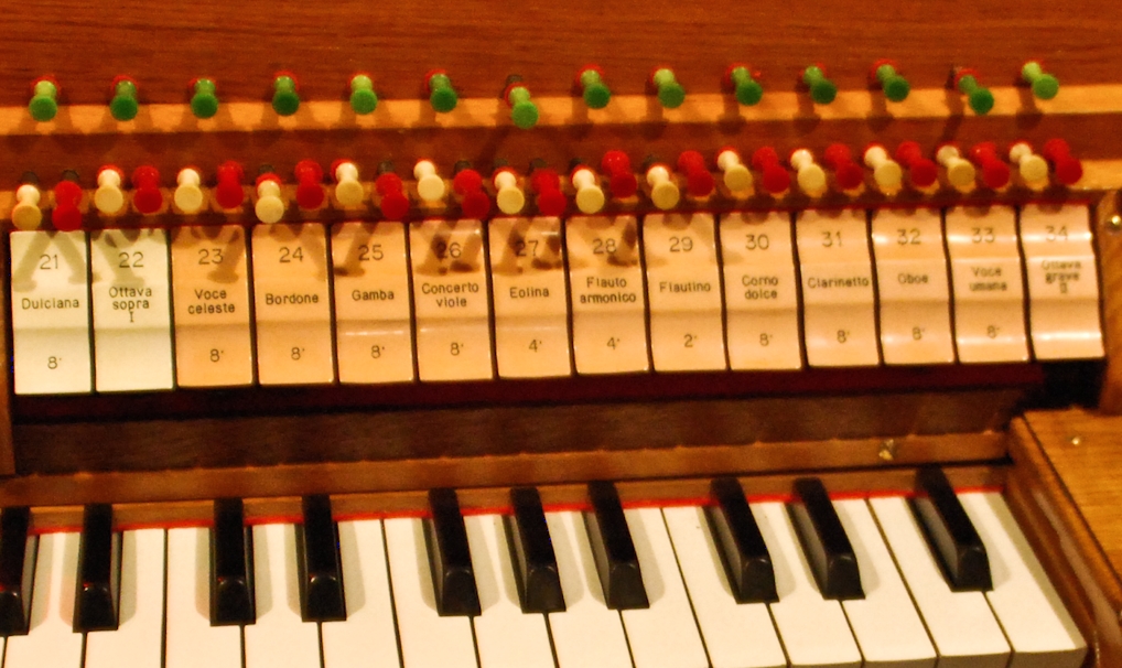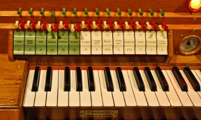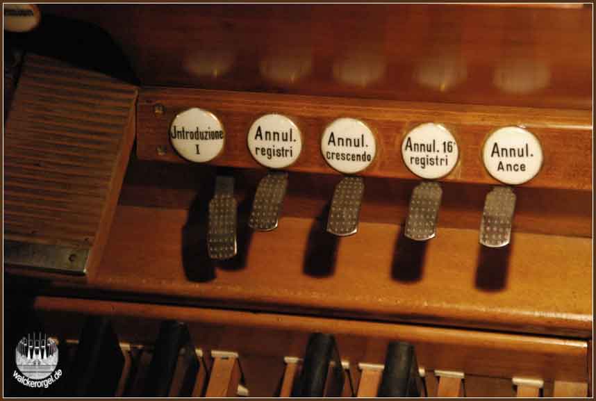 10.Bordon 8' 11.Gamba 8' 12.Konzertvioline 8' 13.Äoline 8' 14.Voix coeleste 8' 15.Sanfthorn 8' 16.Harmonieflöte 4' 17.Oboe 8' 18.Clarinette 8' 19.Voce umana 8' Tremolo |