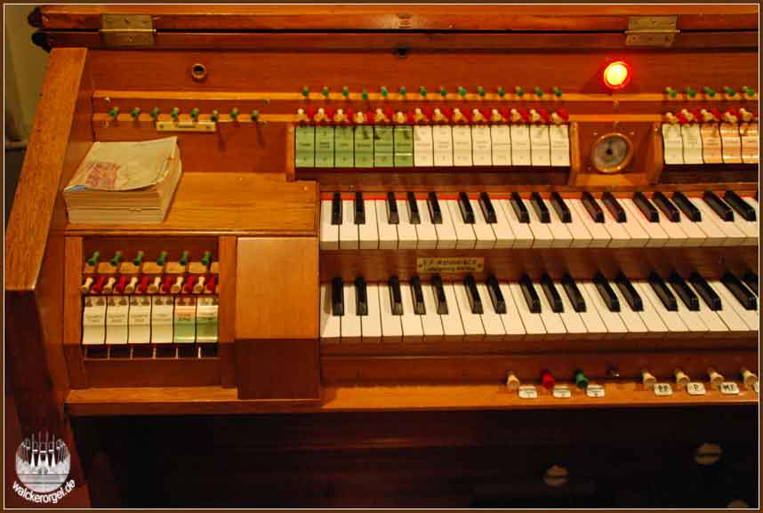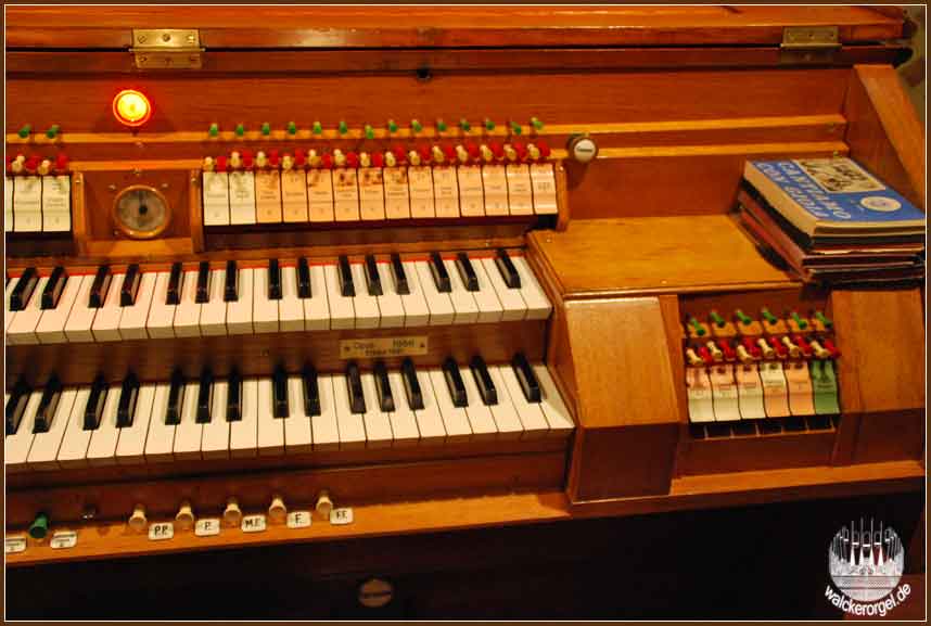 1.Bourdon 16' 2.Principal 8' 3.Traversflöte 8' 4.Quintadena 8' 5.Dulciana 8' 6.Oktave ' 7.Quinte 2 2/3' 8.Mixtur 4f 2 2/3' 9.Trompete 8' Glocken 12 Töne |