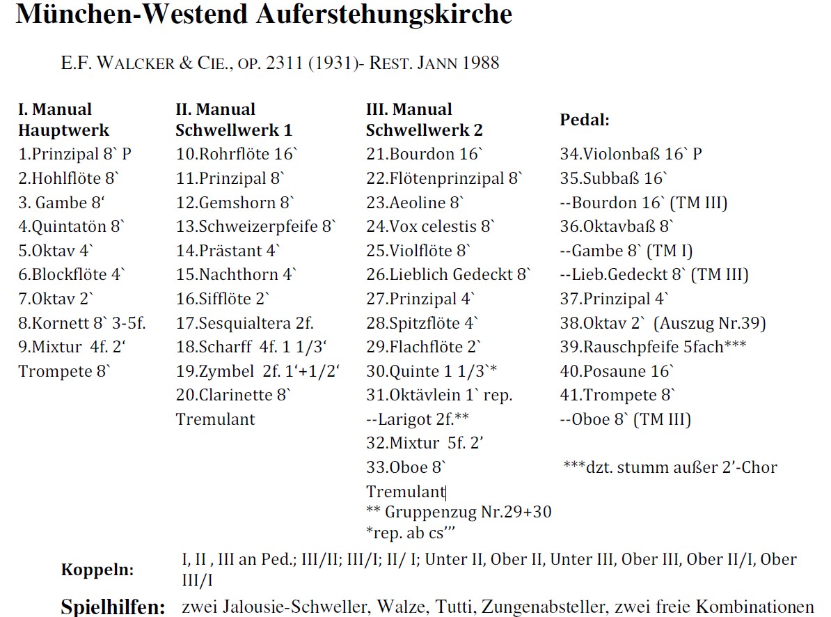 Auf eine interessante Walcker-Orgel, mir bisher völlig unbekannt, wurde ich vor ein paar Tagen hingewiesen. Dieses Instrument in München Westend, gebaut 1931, zeigt in seiner komplexen Klanggestalt wie schnell und umfassend die Orgelreform in Deutschland eingewirkt hat. Sehr schön diese Disposition zu sehen und die Ausführung des Spieltisches, der natürlich mit Kaffeepappbecher und Starkstromelektrik unter den Registerstaffeln ein typisches Bild heutigen Organistenlebens widerspiegelt. |