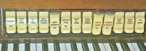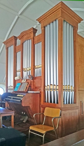 Good afternoon to you, On Saturday 11th April 2015 I had the unexpected privilege of playing for the funeral of an old family friend. The Organ is regularly maintained, but no longer played, as the church does not have an organist. The organ appears to be in very origenal condition, except perhaps the addition of an electric wind pump. ( I do not think the town had electricity at the time of installation). I was amazed by the warmth and richness of the tone. Unfortunately, with only five minutes before the service, I was not able to take the organ for a real "test drive". However it was a real privilege to play. I took the opportunity during the lengthy sermon to take a few pictures, and later two of the whole instrument, which I will attempt to forward to you. The Organ is in deep rural South Africa, about eight hundred kilometres north east of Cape Town. Regards Dieter Kreft |