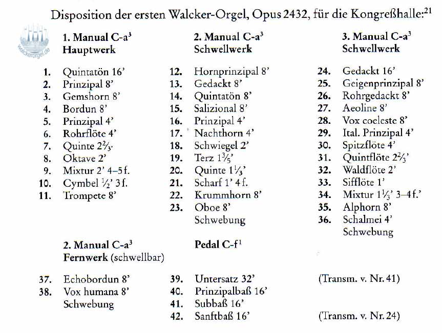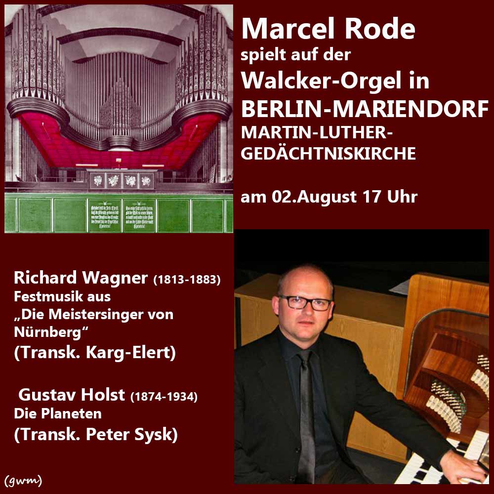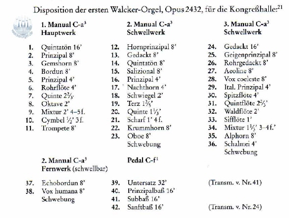 ORGELKONZERT auf der WALCKER-ORGEL OPUS 2432 in der Martin-Luther-Gedächtniskirche Berlin-Mariendorf auf der Walcker-Orgel Opus 2432 von Martin Schulze mit Mp3 files angerichtet und mit einer ganz schönen Reihe an Fotografien. Diese Orgel war das erste größere Orgel-Instrument bei einem Reichsparteitag der Nazis in Nürnberg (1935) und es ist ein Instrument der Orgelbewegung, eine Art Schwester der Bukarester Walcker-Orgel (1939). Daher und aus weiteren Gründen, die in der Betrachtungsweise des Nationalsozialismus begründet liegen, habe ich eine etwas ausführlichere Seite mit diesem Konzert gestaltet und hoffe, dass wir ein paar Schritte näher an die Aufarbeitung dieser Problematik kommen werden. Die Klänge der Orgelbewegung können nicht einfach mit den Klängen der nach dem II.WK gebauten Neobarockorgeln verglichen werden. In den 30er Jahren haben noch |