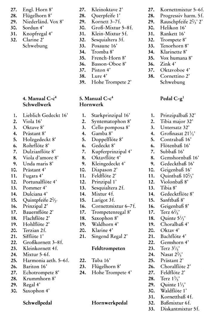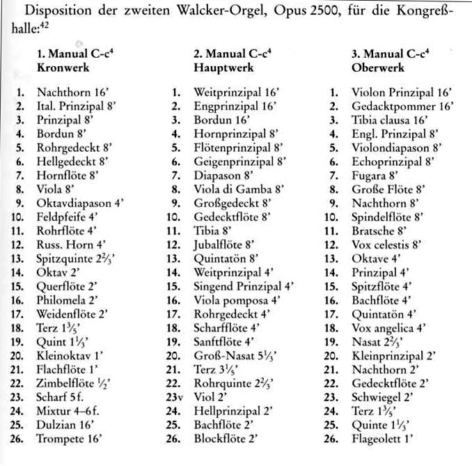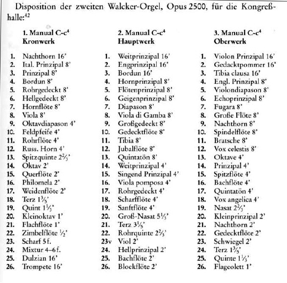 Für den kommenden Parteitag 1936 wurde nun bei Walcker eine nach Plänen von Adam, Kissel und Oscar Walcker entworfene Orgel bestellt, die mit 220 Registern die größte Orgel Europas werden sollte. Diese Orgel, die als Opus 2500 auf unserer Internetseite dargestellt ist und von mir als Opus Diabolo bezeichnet wurde, konnte ebenfalls nur unter erheblichen Zeitdruck von 3 Monaten angefertigt und in der Kongresshalle in Nürnberg eingebaut werden.