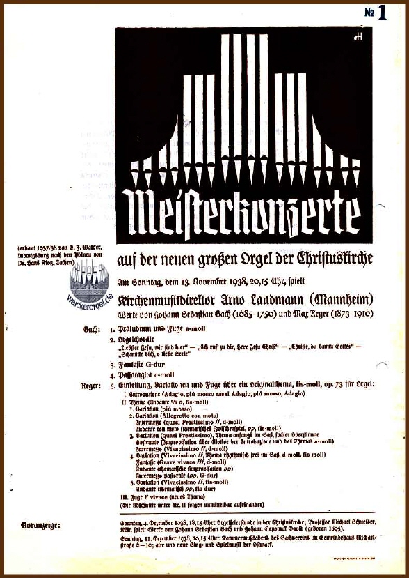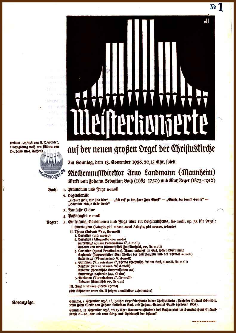 Am 13.Nov.1938 gab KMD Arno Landmann, Mannheim, ein Konzert auf dieser Orgel mit Bach, Präludium und Fuge a-moll und Reger, Einleitung, Variationen und Fuge über ein Originalthema, fis-moll op.74. Am 4.12.38 spielte Prof. Michael Schneider Werke von Bach und J.N.David (gwm)