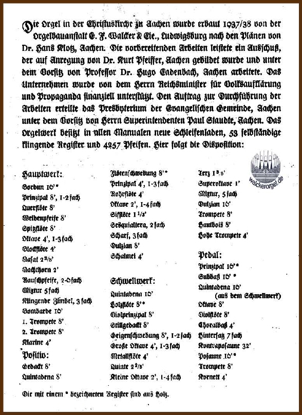 Die hier gezeigte Disposition der Aachener Christuskirche empfinde ich als eine sehr starke Innovation im damaligen Orgelbau, und nach Aussage meines Vater soll das ganz hervorragende Klangergebnisse erwirkt haben. Das gesamte Prinzipalpleno wurde mehrfach eingebracht, was bei den warm intonierten Prinzipalen aus dem Hause Walcker der damaligen Zeit eine ungewöhnliche Klangbreite des gesamten Prinzipalklangs gesorgt hat.
