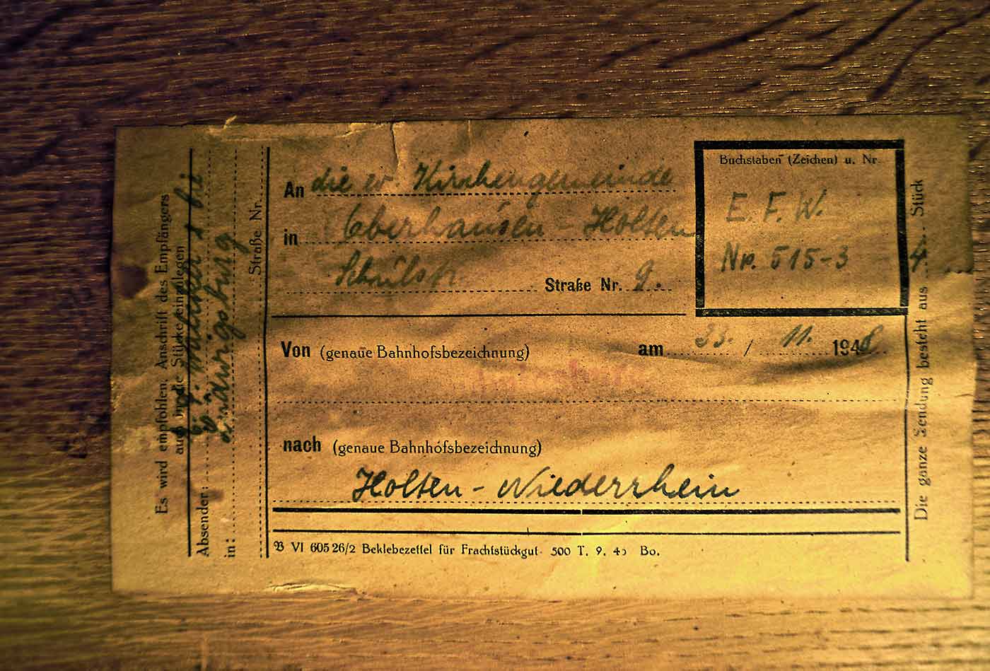 Lieber Herr Walcker-Mayer, kürzlich hab ich mein altes Haus in Korlingen verkauft und ein anderes, größeres auf der gegenüberliegenden Straßenseite erworben. Beim Umzug ist natürlich auch mein schönes Walcker Positiv Opus 2912 mitgekommen und ausgereinigt worden. In meinem Bericht zur Geschichte dieser Kleinorgel hab ich Ihnen von dem originalen Packzettel geschrieben, der noch immer am Instrument klebt. Beim Umzug kam das seltene Dokument unter dem rechten Eichenpylon wieder vollständig zum Vorschein. Ich habe die Gelegenheit genutzt um ein Foto zu machen und möchte es Ihnen gerne zur Verfügung stellen. Herzliche Grüße aus Korlingen, Michael G. Tenschert