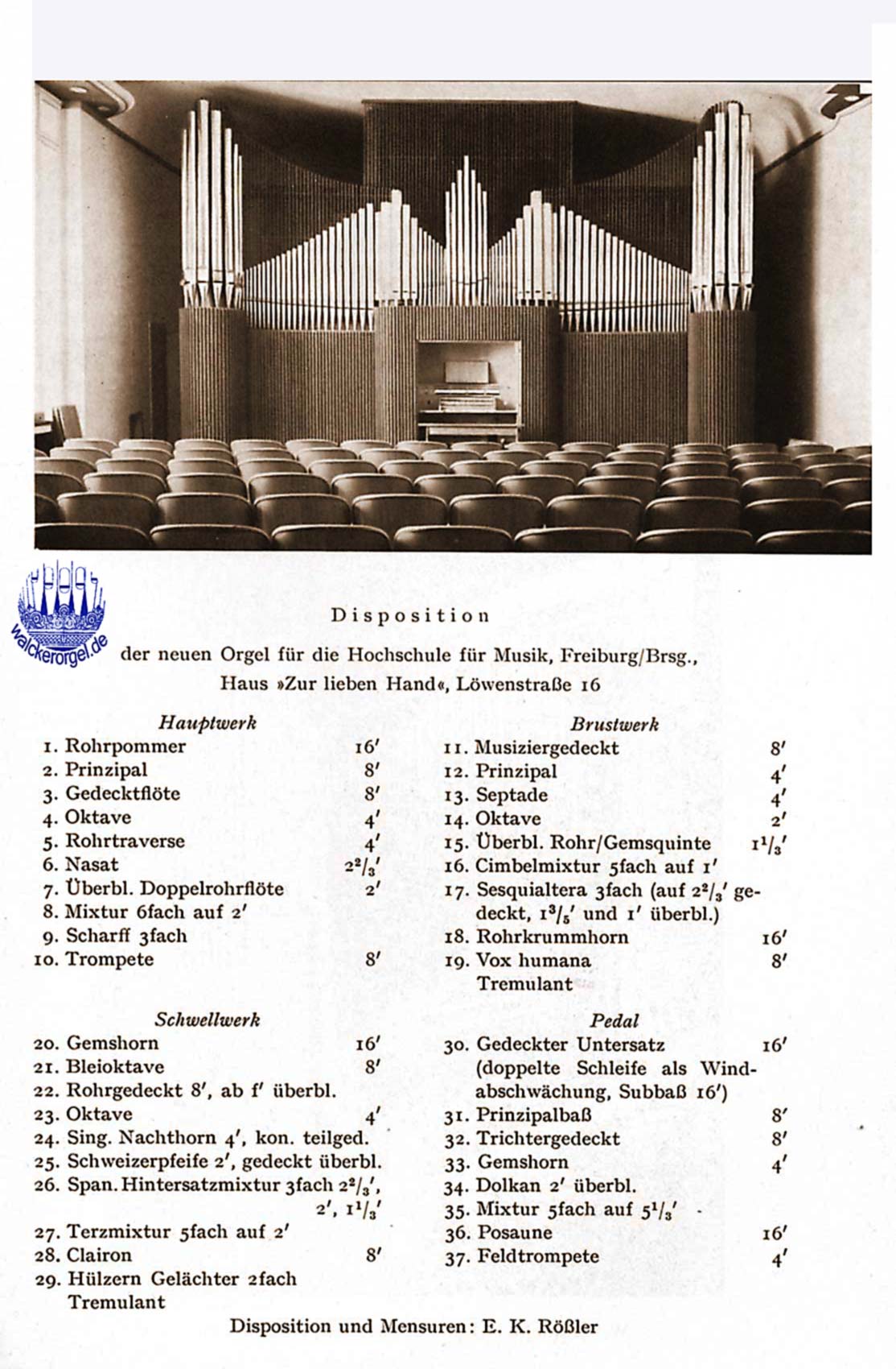 | Diese mit Rössler-Mensuren konzipierte Orgel (Bj. 1959 III/37) steht jetzt in Polen. Wir haben zwei Seiten ausgemacht, wo man a) den hochinteressanten Klang der Rössler-Pfeifen hören kann und b) die Aufstellung der Orgel ganz gut einsehen kann: hier das Video mit Klang und ganz schöner Komposition https://www.youtube.com/watch?v=gER5OSbiVYQ und hier die Aufstellung mit Bildern der jetzigen Orgel: http://organy.art.pl/instrumenty.php?instr_id=1689 . mit Dank an Pierre Lauwers für die Links und Mitteilungen. (gwm März 2013) |