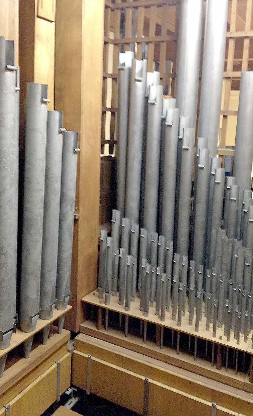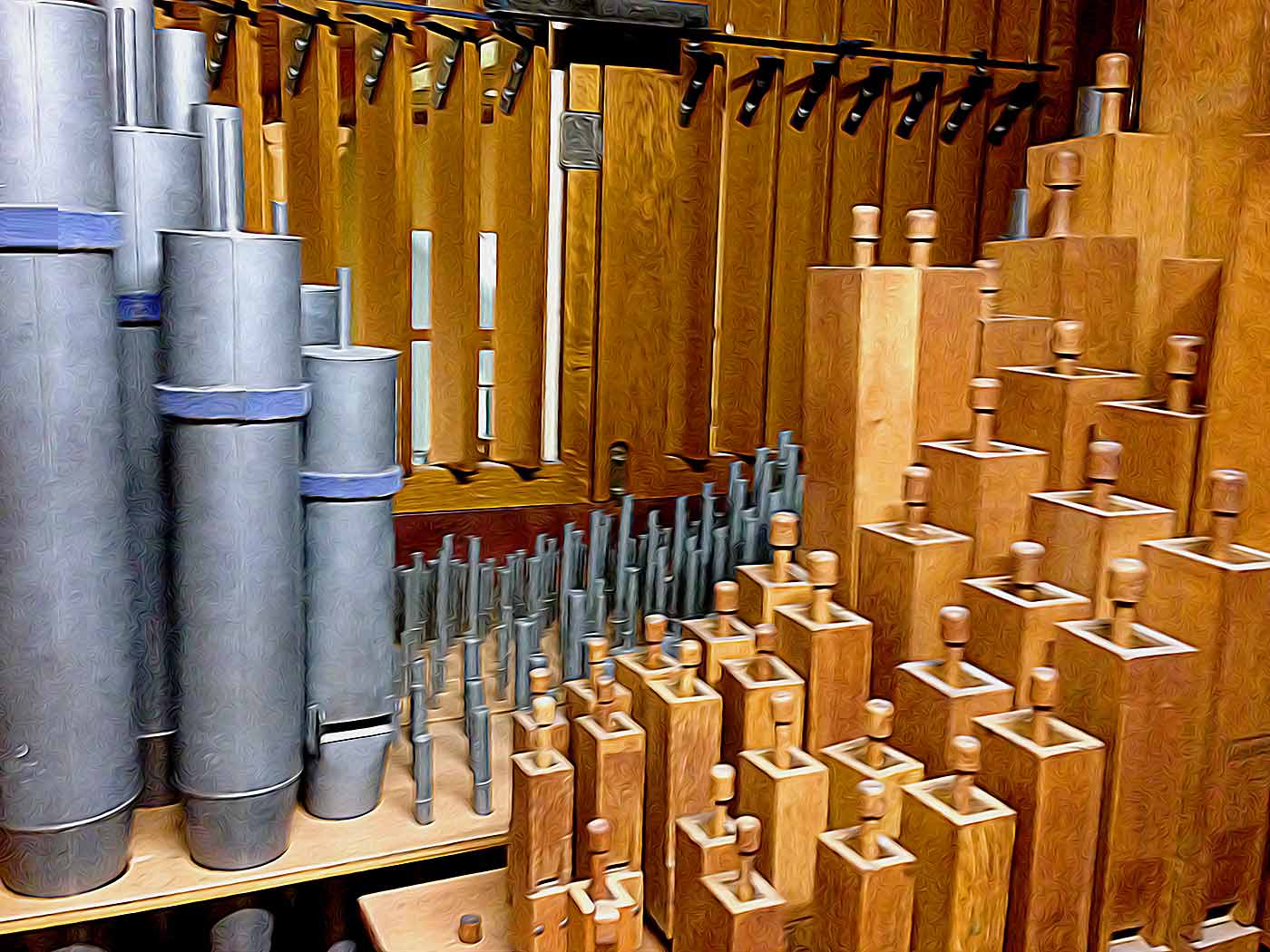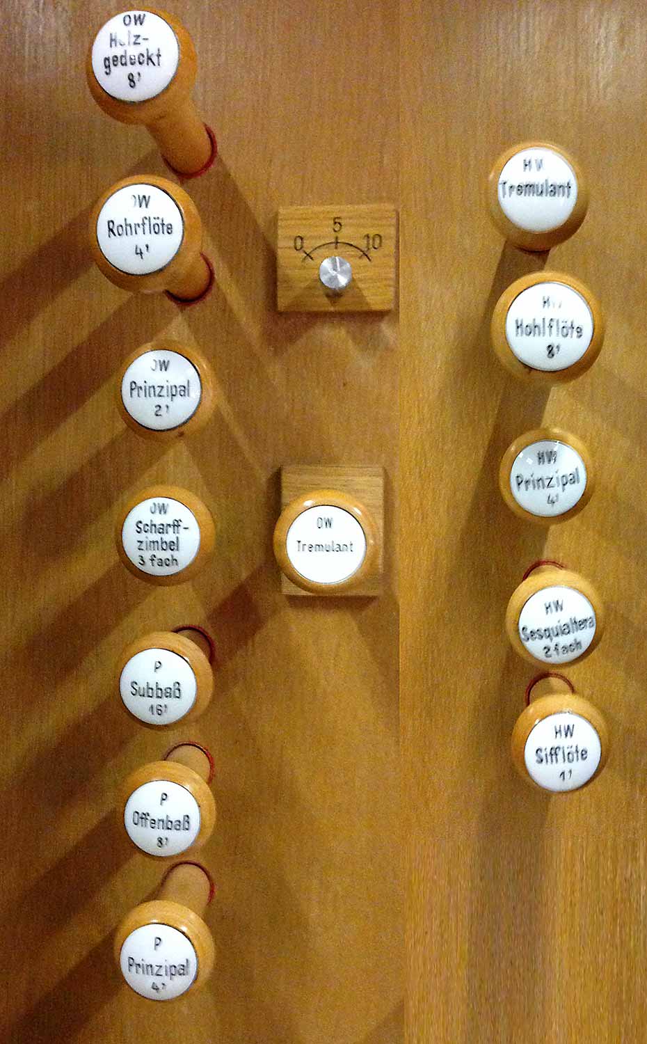 Alle Holzpfeifen in massiver Eiche, der Klang, selbst der Aliquoten, noch feiner und zurückhaltender. Subbaß mit weiter Mensur, gut fundamentierend. |