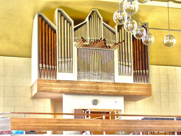 I.Manual Hauptwerk C-g3 1. Prinzipal 8’ 2. Rohrflöte 8’ 3. Oktave 4’ 4. Koppelflöte 4’ 5. Waldflöte 2’ 6. Mixtur 4-5fach 1 1/3’ 7. Span. Trompete 8’ II.Manual Positiv 8. Holzgedackt 8’ 9. Prinzipal 4’ 10. Rohrpommer 4’ 11. Oktave 2’ 12. Quintflöte 1 1/3’ 13. Sesquialter 2fach 2 2/3’ 14. Scharfzimbel 3-4fach 15. Krummhorn 8’ Tremolo Pedal C-f1 16. Subbaß 16’ 17. Prinzipalbaß 8’ 18. Rohrgedackt 8’ 19. Gemshorn 4’ 20. Nachthorn 2’ 21. Mixtur 4fach 22. Fagott 16’ 23. Schalmey 4’ Normalkoppeln |