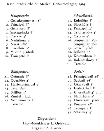 Die Orgel der Donaueschinger Marienkirche wurde im Jahre 1963 als Opus 4474 von der Orgelbaufirma E. F.Walcker aus Ludwigsburg gebaut. Die Orgel hat derzeit 38 Register, verteilt auf drei Manuale und Pedale. Sie besteht aus 2765 Pfeifen in Holz, Zinn, Kupfer und Zink. Die Orgel ist sehr überholungsbedürftig. Wie verschiedene Gutachten belegen, machen mehrere Defekte und der Schmutz vieler Jahre seit der letzten Generalüberholung eine Sanierung des wertvollen Instruments dringend notwendig. Auf der gesamten Orgel und den Pfeifen hat sich eine fettige Staubschicht abgelagert, die eine vollständige Zerlegung und Reinigung des Instruments erforderlich machen. Außerdem müssen Verschleißteile ersetzt und die Spielanlage (Spieltisch und elektrische Verbindung zu den einzelnen Registern) überholt werden. Zusätzlich sollen ein zusätzliches Register und eine moderne Setzeranlage eingebaut werden.