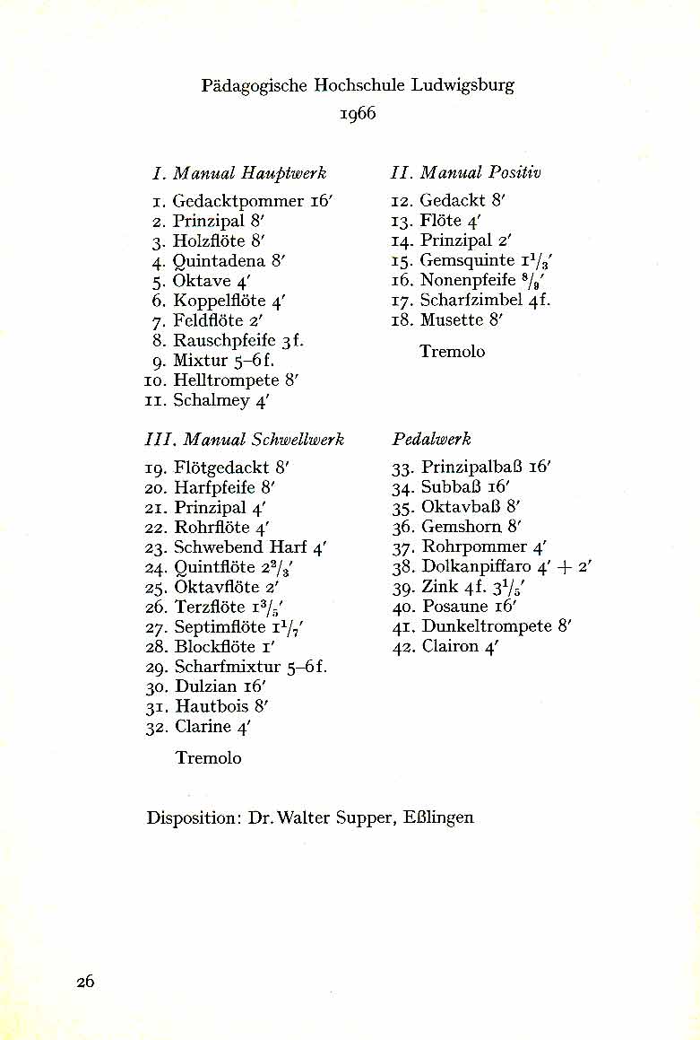 ein Organist aus Cornwall, der vor Jahrzehnten Deutschland besuchte und dort die beiden Walcker-Orgeln Opus 4796, Ludwigsburg PH, III/42, elektr. Schleifladen, Bj 1966 und das E-Positiv Opus 4886, II/12, antraf, die er als die "most wonderful and memorable sound that I had never heard in this country before..." bezeichnete, und nun in einer Email weitere Daten von diesen Instrumenten suchte. Bemerkt hatte der seit 40 Jahren tätige Organist, dass er sich wunderte, nichts von diesen Instrumenten auf dem Internet zu finden. Auch das eine Bewertung des Walcker-Orgelbau aus den 60er Jahren.