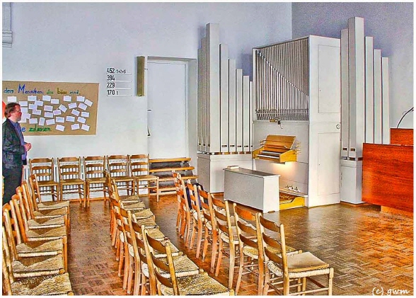 Wuppertal - Lichtenplatzer Straße, Evang. Gemeinde Die Orgel wurde 1969 als Opus 5377 – 9/II von der Firma E.F.Walcker & Cie in Ludwigsburg gebaut Disposition nach Fertigstellung der Arbeiten I. Manual C-g3 = 56 Töne 1. Gedeckt 8’ (mit verbessertem grundiertem Klang 2. Prinzipal 4’ (Klangverbesserung, wärmer) 3. Oboe 8‘ neu, mit neuen Pfeifen, neues Schild, Raster + Stock neu II. Manual 4. Gemshorn 8’ (Klangverbesserung, wärmer) 5. Rohrflöte 4’ (Klangverbesserung, wärmer) 6. Prinzipal 2’ (Klangverbesserung, zarter) 7. Quinte 2 2/3‘ (12 Pfeifen neu, Rest neue Intonation, neue Raster) Pedal C-f1 = 30 Töne 8. Subbaß 16’ (Klangverbesserung) 9. Choralbaß 4’ (Klangverbesserung, wärmer) KOPPELN : I/P, II/P, II/I Mechanische Spieltraktur und Registertraktur |
