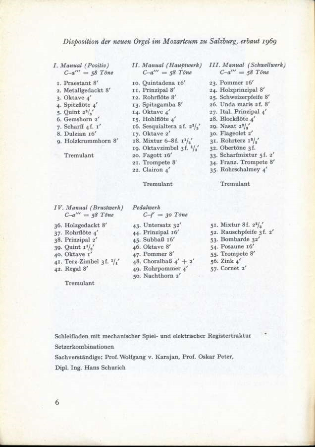 Die Walcker-Orgel Opus 5400 Baujahr 1969-1970, III/57, m/e, Mozarteum Salzburg,(neu auf walckerBlog mit einigen Zeitungskritiken zu Konzerten von Karl Richter) geplant und gestaltet von Karajan, Peter, Schurich, stellt wohl eine der letzten Konzertsaalorgeln der Firmen Walcker-Walcker-Mayer dar, die im deutschsprachigen Raum eine gewisse Bedeutung besessen hat, und die anfangs sehr begeistert aufgenommen wurde. Dies allein ist mein Motiv, die Orgel ausführlicher darzustellen. Ich hoffe man unterstellt mir also keine Ressentiments gegenüber einem hochwertigem Orgelbau heute, sondern diese Aufarbeitungen der sechziger Jahre soll zeigen, wie die damalige Zeit der Orgelbaugestaltungen und ihre Betrachtungen über den damals gegenwärtigen Orgelbau war.