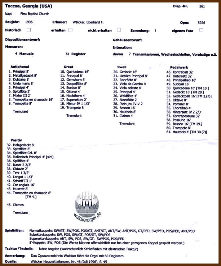 Opus 5926 Walcker-Orgel in Toccoa/Georgia