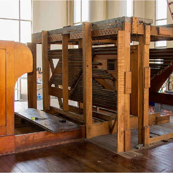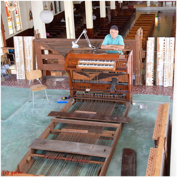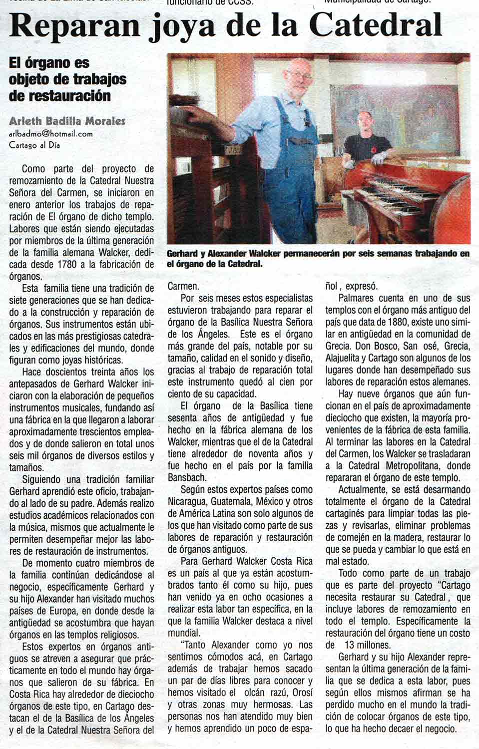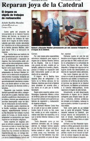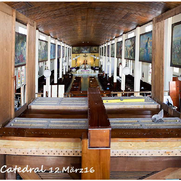 der Orgel (Opus 3589 Bj. 1956) l in der bekannten Basilika "de Ntrs. Sra. de Los Angeles" in Cartago, Costa Rica. Die Orgel ist mit 31 Registern die größte des Landes. Es handelt sich um eine elektrische Kegelladenorgel, die mit einer warmherzigen Intonation und Konzessionen an den südamerikanischen Geschmack eine wunderbare Perle in der Klangwelt Mittel-und Südamerikas darstellen wird. Viele Jahre haben wir mit unseren Freunden in Costa Rica auf diesen Moment hingearbeitet. Berücksichtigt man den Rahmen der Costa Ricanischer Landschaft und die unheimliche Begeisterung der Bevölkerung in Sachen Orgelmusik, so wird wohl eine der schönsten Orgelarbeiten vor uns liegen.