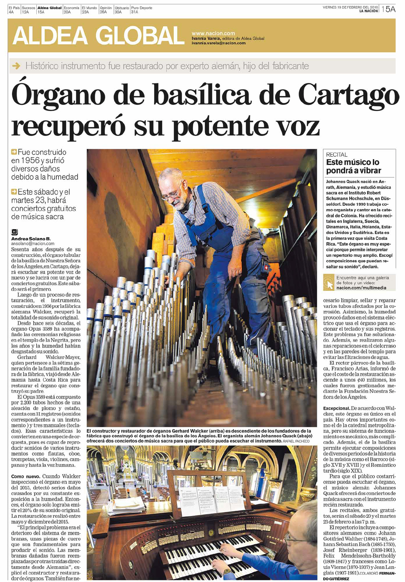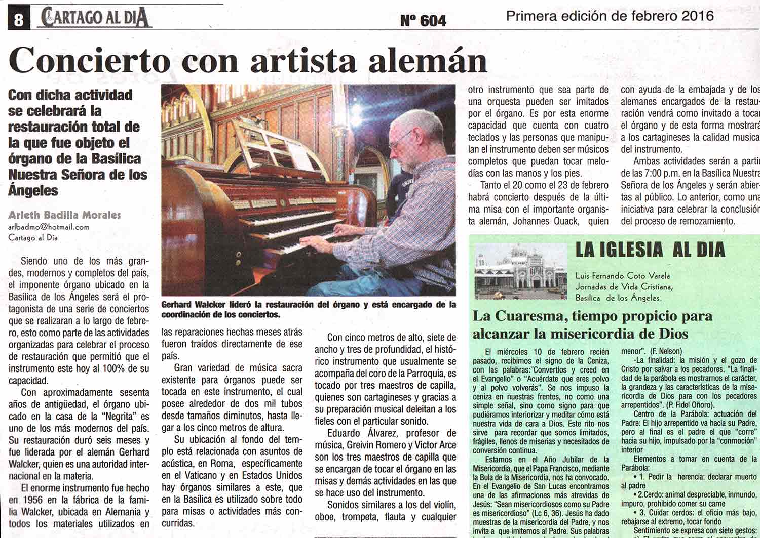 Die Walcker-Orgel in der Basilika von Cartago, die 1956 als eine Synthese von Orgelromantik und Orgelbarock entstand, hat sich durch die Konzerte von Herrn Quack als hervorragende Konzertorgel empfohlen. Sie ist von der Größe und dem Farbenreichtum mit keinem anderen Instrument im Lande vergleichbar.