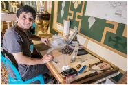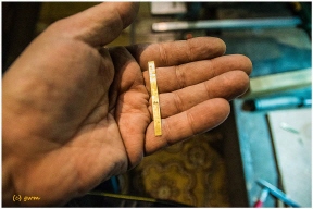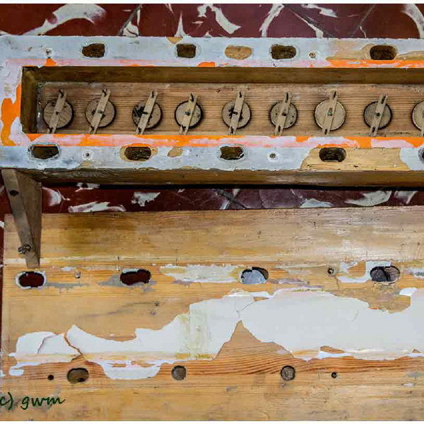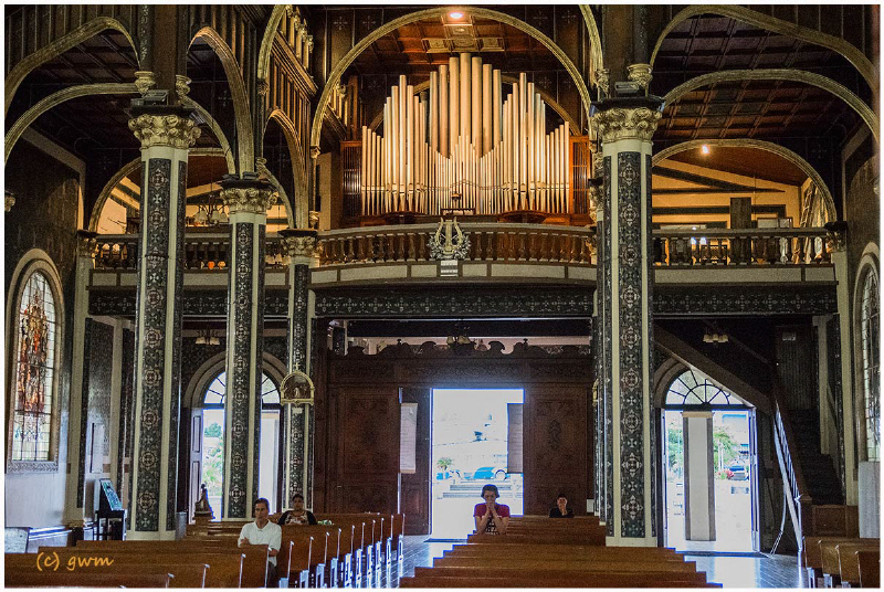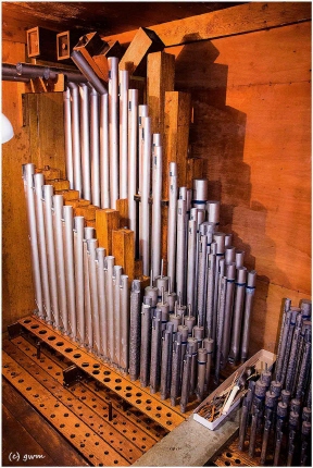 | Die zweite Pfeifenreihe wird von der Gambe 8' gestellt: ein wunderbares Register, das von c an in eine Aeolinenmensur übergeht und fantastischen, satten Harmoniumklang aufscheinen lässt. Die Bordunpfeifen dahinter sind mir einen tick zu eng mensuriert, was den Orgelbauer beim Einbau veranlasst hatte, die Aufschnitte zu erniedrigen und damit den Quintton zeichnend hervortreten zu lassen. Ohne diesen, ist das Register von C-h kaum am Spieltisch wahrnehmbar. Wunderbar die Rohrflöte 8'. Wieder eine schöne, zurückhaltende Flöte, die in diesem Lande der knattergetunten Mopeds und Brüllaffen, zwar wenig Chancen auf Erhörbarkeit hat, aber als stille Mahnerin ihre Funktion wahren wird. Dazu kommen nun der butterweiche Principal 4' und die gedeckte Bergflöte 4'. Ein ganz großartiges Werk. |