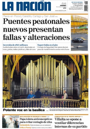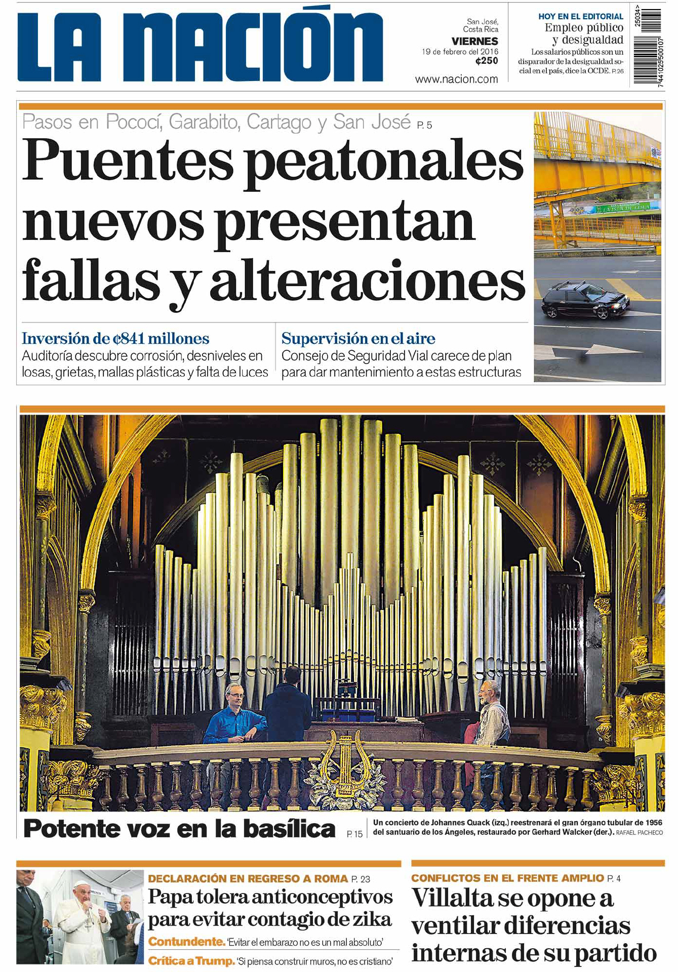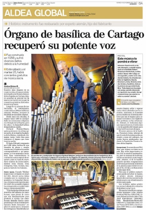 | Auf der Webpage der Zeitung La NACIÓN können Sie ein Kurzvideo über Herrn KMD Quack am Spieltisch der Orgel und Bilder vom Fotografen der Zeitung sehen. Das Video werde ich demnächst auf unseren Seiten zeigen. Auf der ersten Seite dieser größten Zeitung Costa Ricas zu landen hat uns natürlich alle sehr gefreut. Am besten aber ist das, was wir bisher von Herrn Quack zu hören bekamen: besser kann man diese Orgel kaum präsentieren !! Die Konzerte von Quack werden wir aufzeichnen und teilweise hier wiedergeben. (hochauflösende PDF Seite01 [2 140 KB] , Seite02 [2 433 KB] ) Botschafter Dr. Winkelmann: "...das ist schon ein gutes Gefühl, auf der ersten Seite der La Nación eine deutsche Orgel mit zwei deutschen Kulturträgern zu sehen!" |