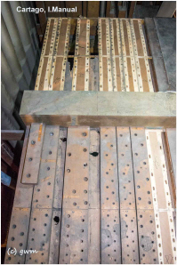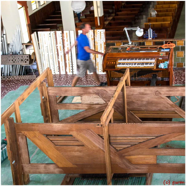 Nun also sind wir bereits über eine Woche in der Wallfahrtskirche "Los Angeles" in Cartago tätig. Es handelt sich bei dieser Orgel um eine Walcker-Orgel aus 1957-58, die "erdbeben- und comejensicher " gebaut wurde und nach meinen Einschätzungen dieses Versprechen gut eingelöst hat. Alle Holzteile sind aus massiver Eiche, die elektropneumatische Konstruktion ist massiv und unanfällig. Wogegen die Orgel allerdings kaum in der Lage war, sich entschieden zu wehren, es ist der Regen, der hier in größeren Dimensionen auf die Orgel eingewirkt hat. Fast einen halben Meter stand das Instrument unter Wasser.