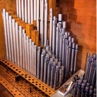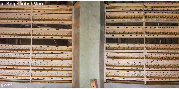 Beim "Corno di Noche 8'" = Nachthorn 8', direkt hinter der Koppelflöte, gebaut wie eine Rohrflöte, aber mit überlangen Röhrchen, C-H gedeckt, hat mich zunächst irritiert, dass beim C, ausgeführt in massiven Eichepfeifen nur ein 6,5mm großes Windeinlassloch für jämmerlichen Grundton sorgte. Klar, dass das geändert wurde.