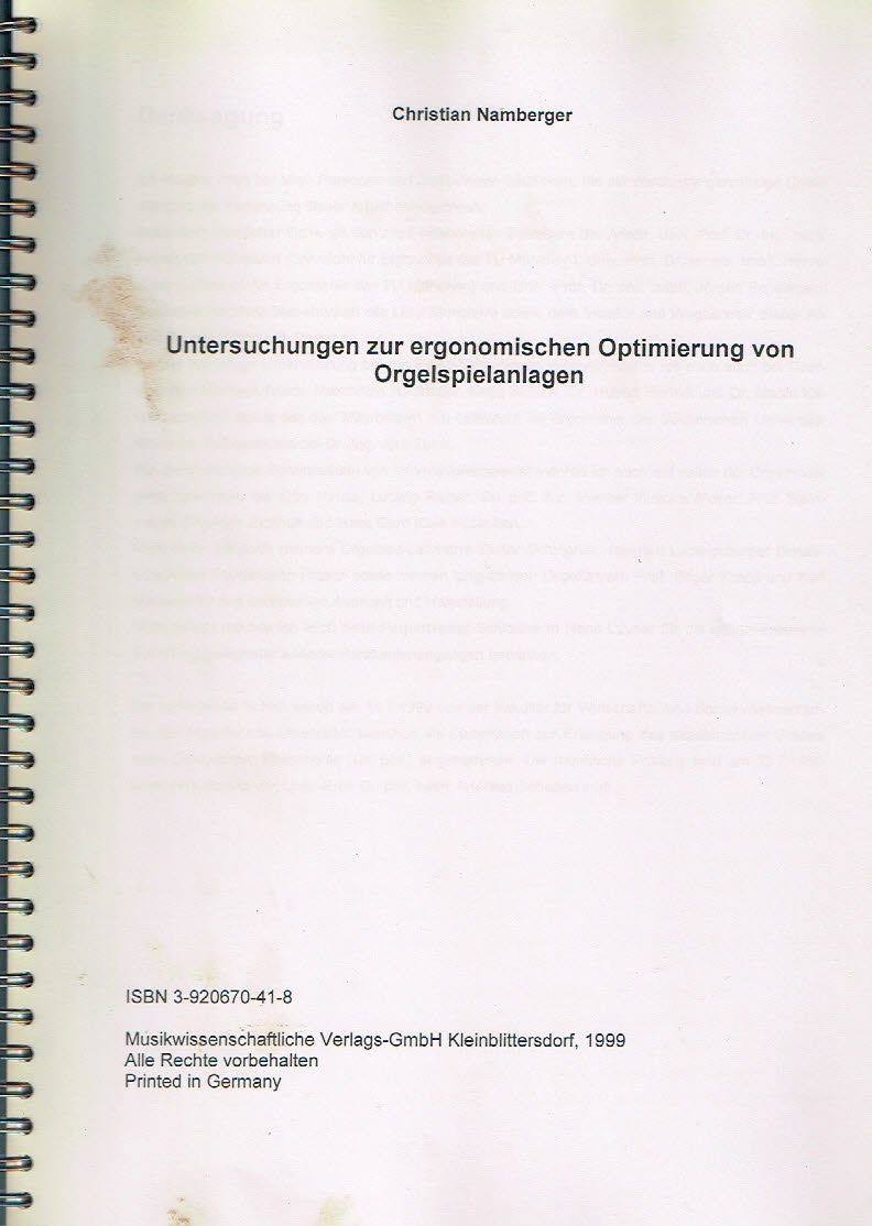 Untersuchungen zur ergonomischen Optimierung von Orgelspielanlagen, Namberger, Musikwissenschaftl. Verlags-GmbH, 1999, 126 Seiten, 295x220mm |