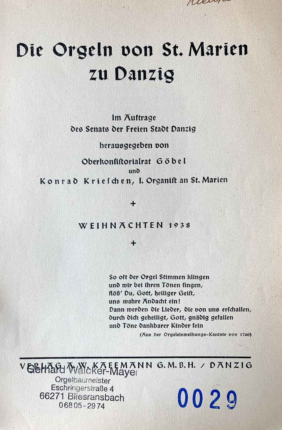 Die Orgeln von St. Marien zu Danzig, Göbel/Krieschen, 1938, 60 Seiten |