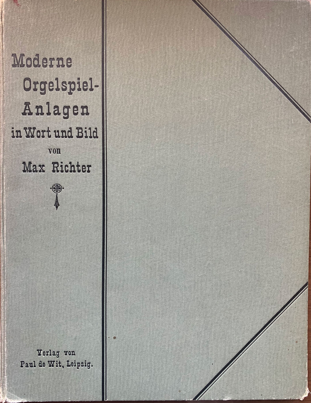 Moderne Orgelspielanlagen in Wort und Bild von Max Richter, Paul de Wit, 1906, 81 Seiten, gebundenes Buch mit beiliegenden Zeichnungen von Spieltischmaßen |